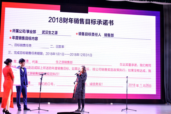 今年的年會與往年年會最大的不同為:增加了年度銷售目標承諾的環(huán)節(jié)。生之源各區(qū)域的銷售代表上臺,對2018年的銷售業(yè)績立下目標。言語之間,充滿了豪情壯志。