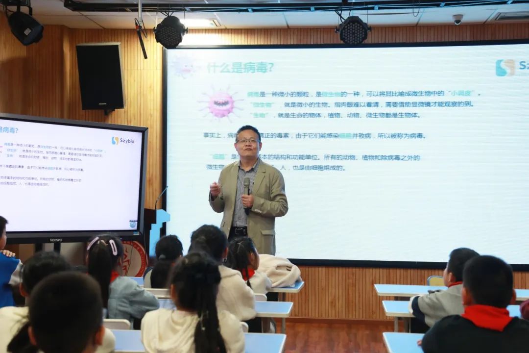 華權(quán)高以病毒的起源為切入點(diǎn),用幽默風(fēng)趣的語言、生動(dòng)形象的方式,從什么是病毒、身邊有哪些常見病毒、為什么要檢測病毒、怎么檢測病毒、生活中如何預(yù)防病毒感染、科學(xué)家在病毒檢測中做了哪些貢獻(xiàn)六個(gè)方面,為同學(xué)們講解了病毒相關(guān)知識(shí)。